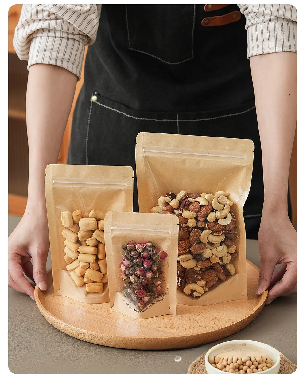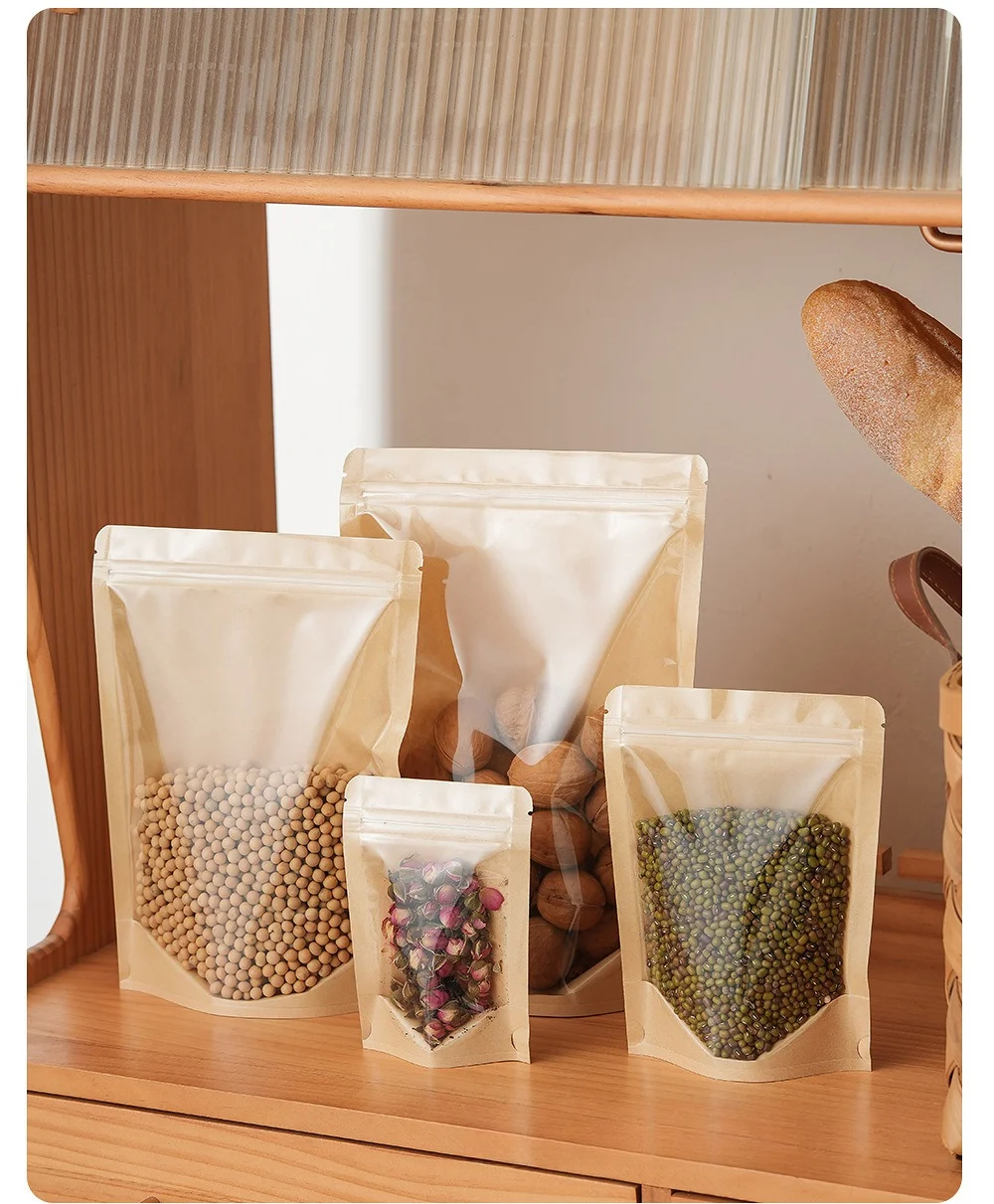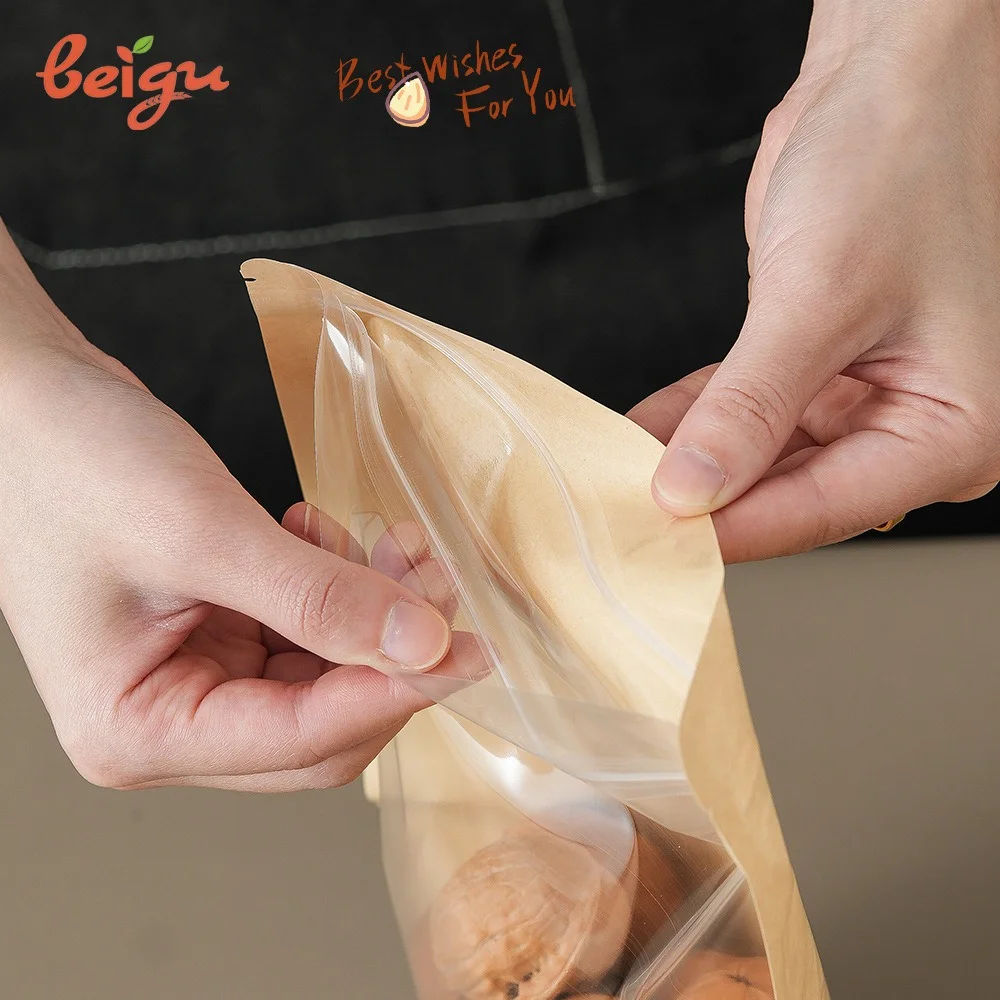 Beigu Disposable Eco-Friendly Kraft Paper Transparent Self-Standing Zipper Self-Sealing Bag Flexiloop Handle for Cooked Food
