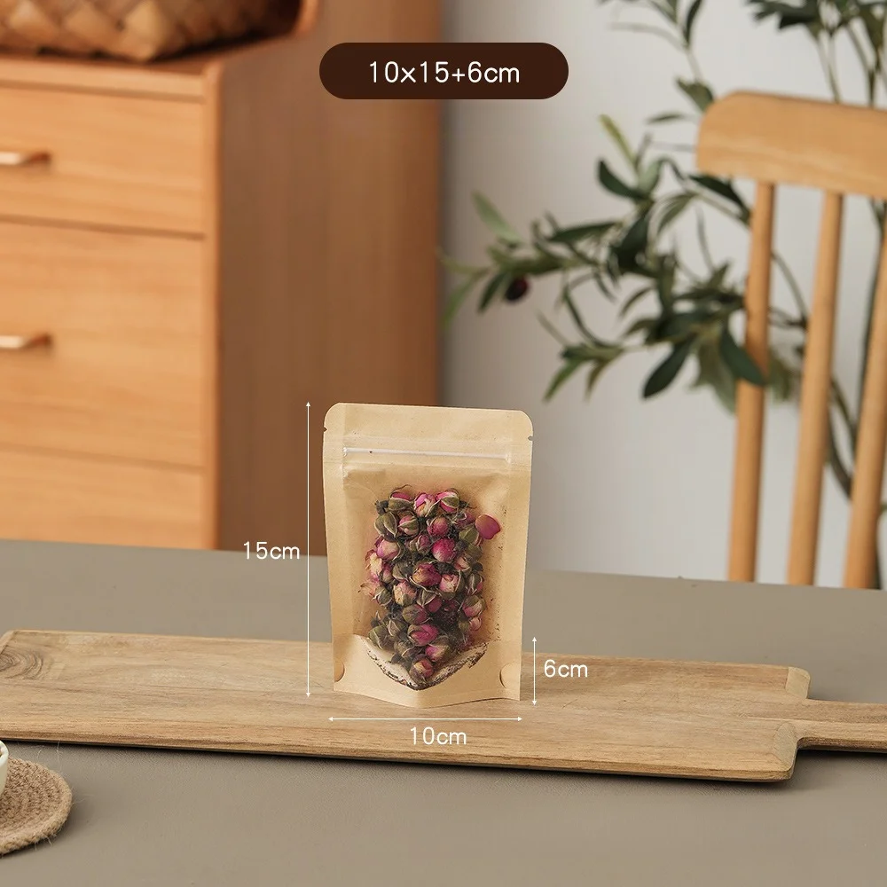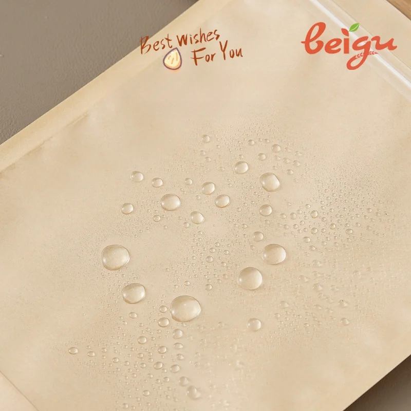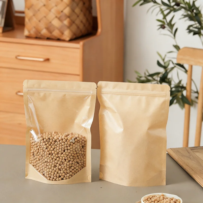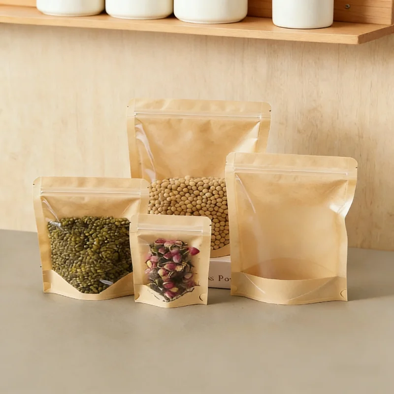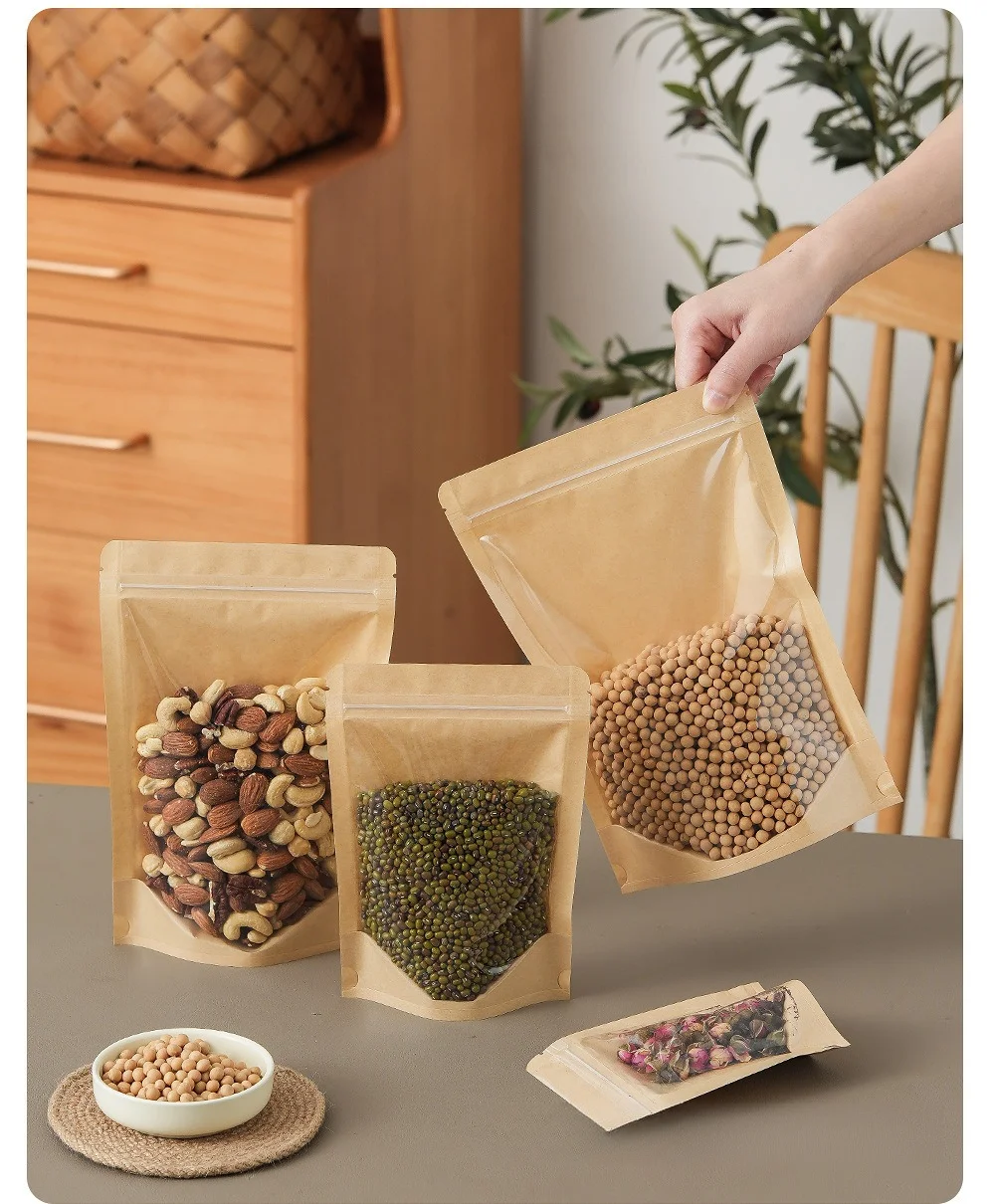 Beigu Disposable Eco-Friendly Kraft Paper Transparent Self-Standing Zipper Self-Sealing Bag Flexiloop Handle for Cooked Food